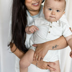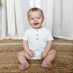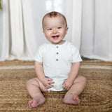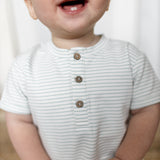 Une jolie barboteuse avec boutons en coconut et des snaps dans l'entrejambe. Belle confo et pratique. Bref, tout ce que ton enfant voudra porter cet été ! 3 boutons en coconut et des snaps dans l'entrejambe pour un changement de couche rapido.
