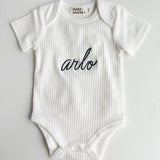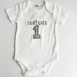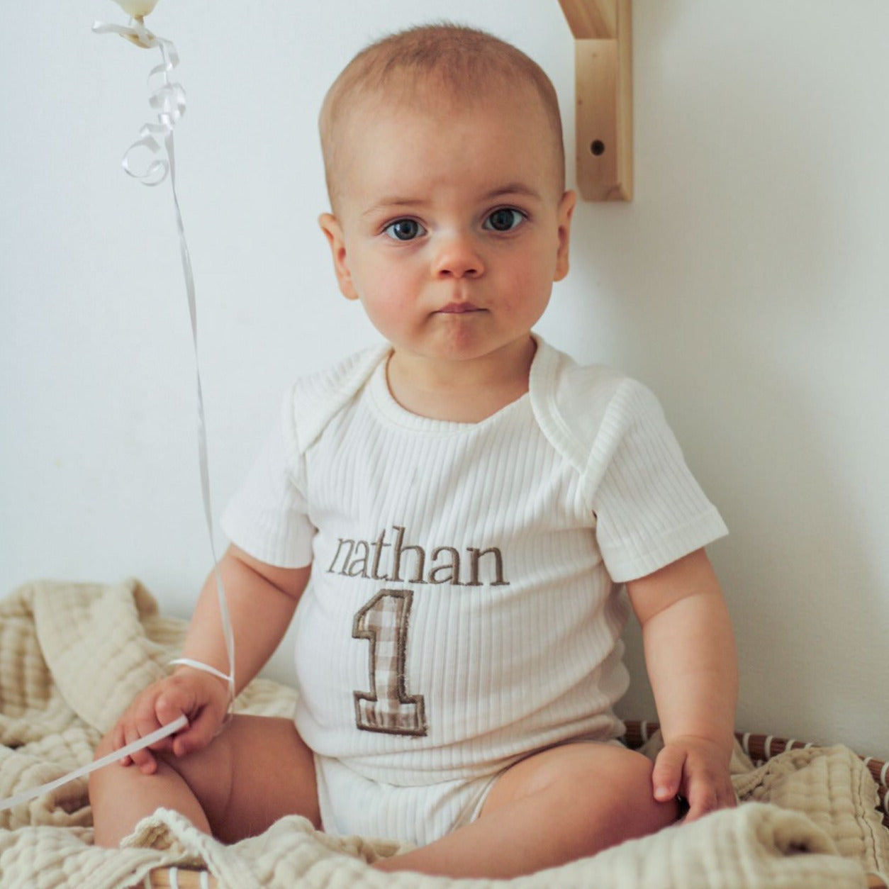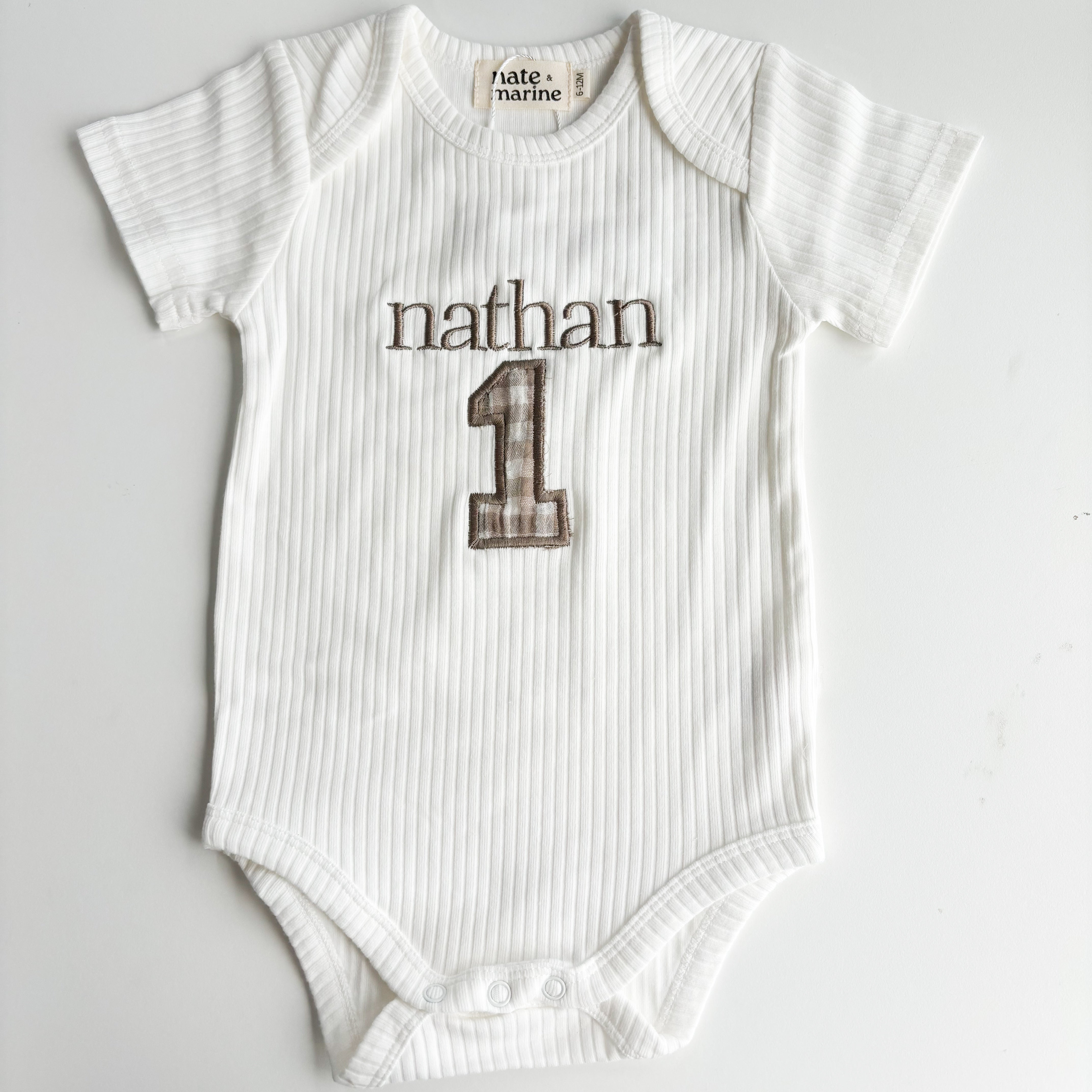 Sur la photo, le cache-couche est fait avec le design anniversaire appliqué avec tissu à carreaux. Le cache-couche Arlo est fait avec le fil marine et l'écriture attachée.