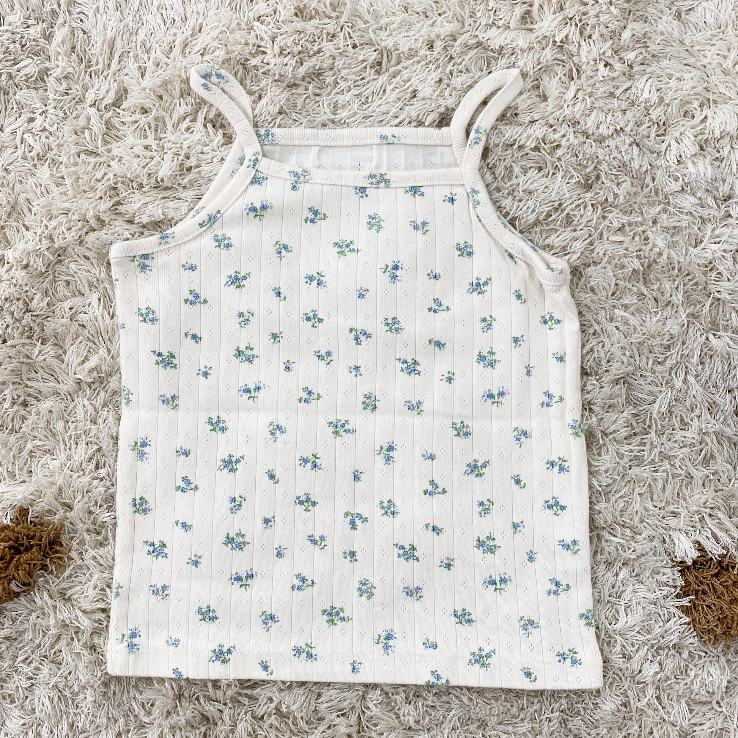 Jolie camisole à motif de fleurs bleues. Dans le plus magnifique des tissus pointelle.