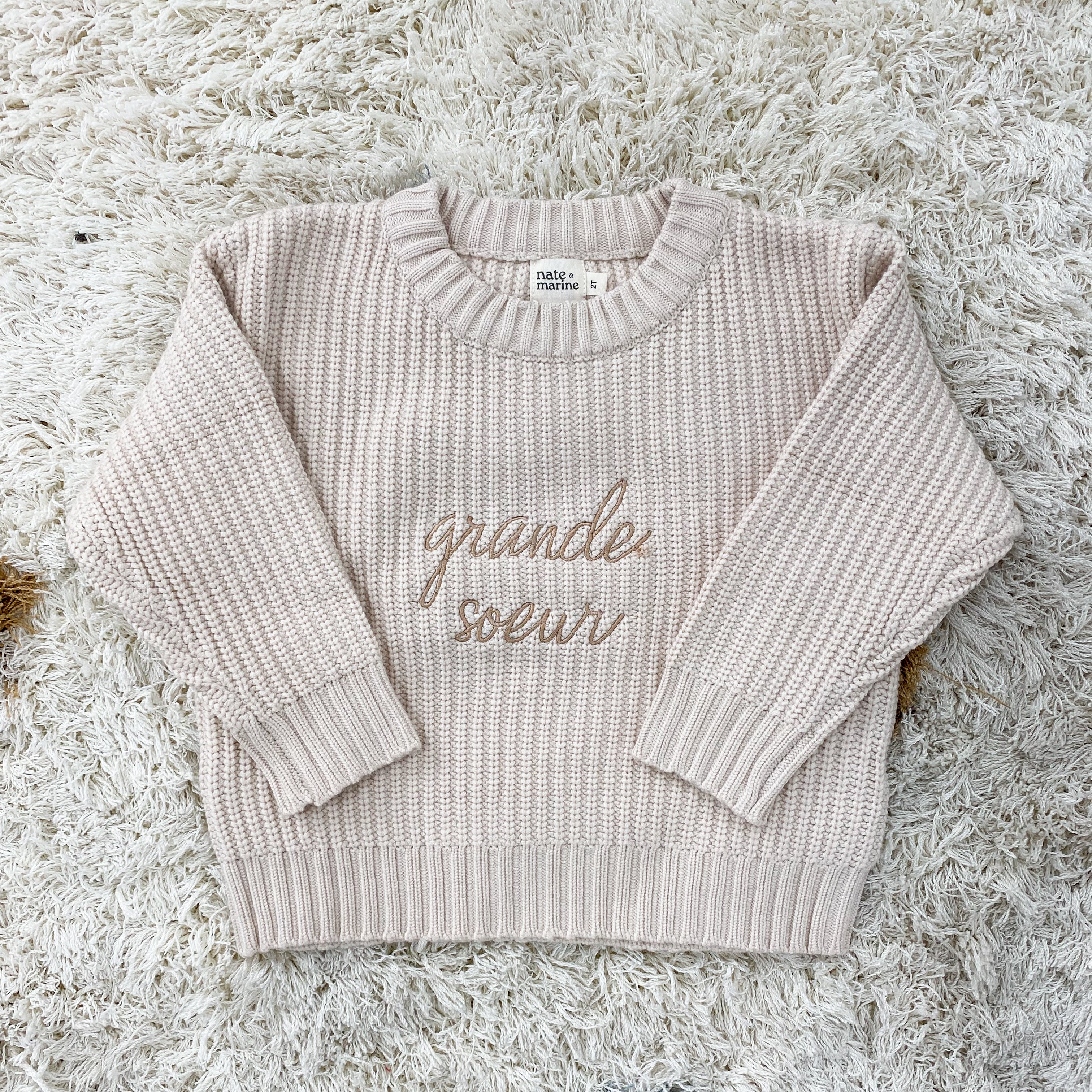 Tricot prêt à partir arctic avec l'écriture grande soeur en beige.