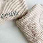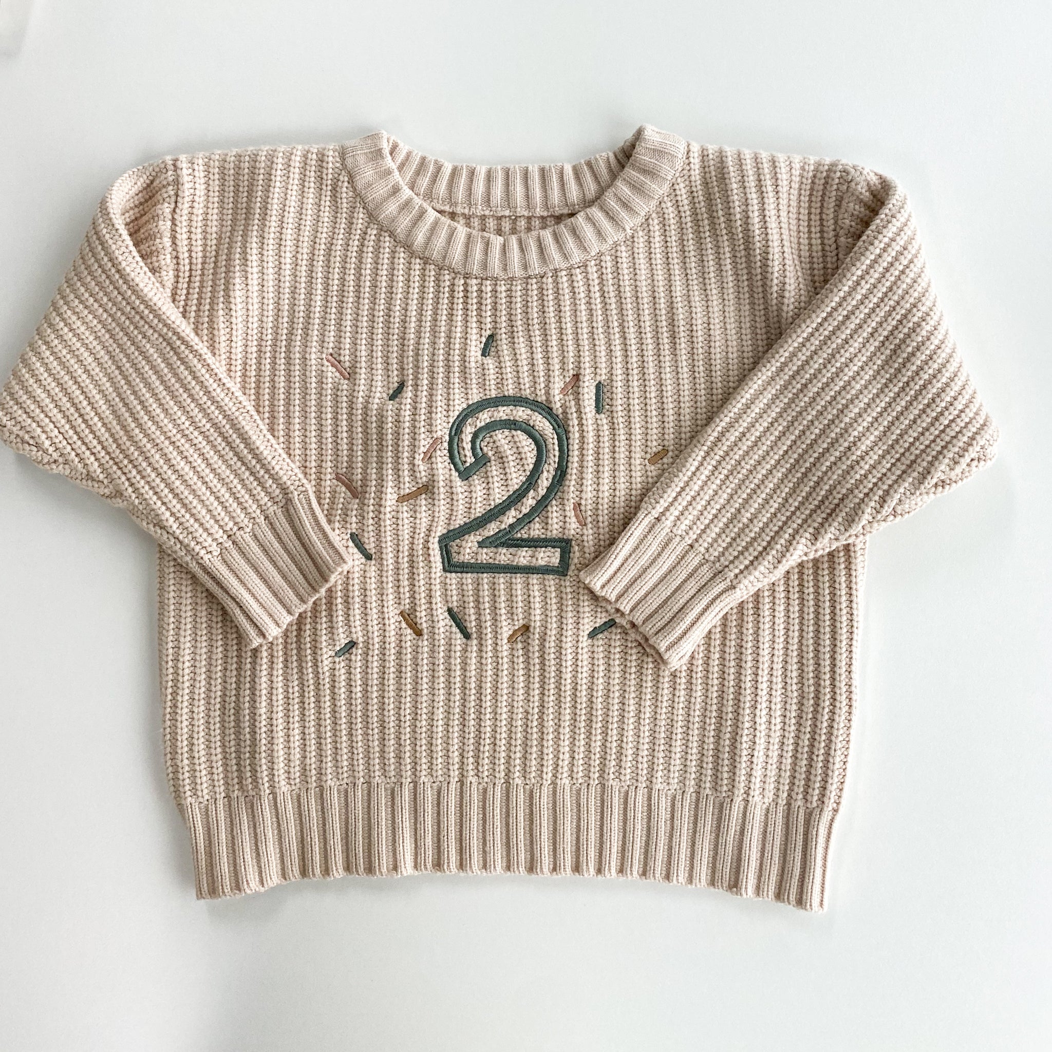 Sur la photo, le tricot anniversaire est personnalisé avec le chiffre en couleur sauge.